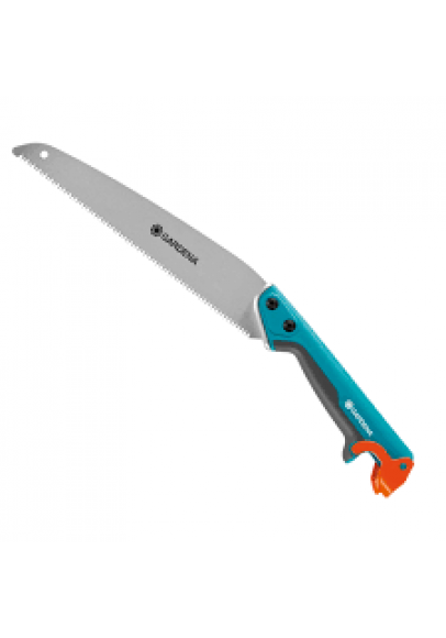 Садовая пила GARDENA 300 РР имеет длину полотна 300 мм и подходит для различных целей - в зависимости от Ваших задач. Пила удобно лежит в руке, облегчая процесс работы. Практичная функция: просто зафиксируйте пилу с телескопической рукояткой combisystem - для удобной работы на высоте до 5 метров.Твердое хромрованоезащищает лезвие от коррозии и ржавчины. Закаленные зубья с тройной заточкой обеспечивает исключительную остроту и чистоту среза. Садовая пила не соскальзывает даже при движении на себя и снабжена ушком для петли, а также чехлом для лезвия, что обеспечивает безопасное хранение. На соединение пилы GARDENA с рукояткой combisystem гарантия составляет 25 лет.